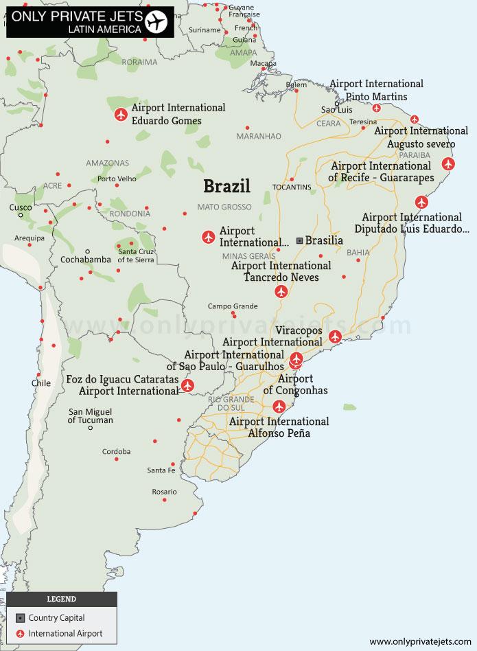 المطارات في البرازيل الخريطة. البرازيل المطارات خريطة (أمريكا الجنوبية - أمريكا) إلى الطباعة. البرازيل المطارات خريطة (أمريكا الجنوبية - أمريكا) لتحميل. يعد مطار Congonhas-Deputado Freitas Nobre كما هو موضح في خريطة المطارات البرازيلية هو الثاني من بين أربعة مطارات تخدم ساو باولو. ويقع على بعد حوالي 10 كم من وسط المدينة. باعتبارها واحدة من المطارات الأكثر ازدحاما في البرازيل، فإنه يتعامل مع أكثر من 20 مليون مسافر كل عام. المطار بمثابة مركز للخطوط الجوية غول وLATAM البرازيل التي جنبا إلى جنب مع شركات الطيران الأخرى توفير الرحلات الجوية الإقليمية. مطار كامبيناس، المعروف أيضا باسم مطار فيراكوبوس، يخدم مدينة كامبيناس. ويتعامل المطار مع أكثر من 10 ملايين مسافر سنوياً، وهو بمثابة مركز للخطوط الجوية البرازيلية Azul.